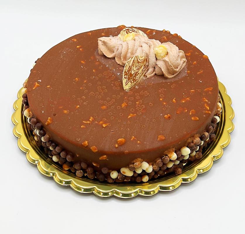 Chocolate sponge cake with hazelnut praline cream covered in milk chocolate ganache with chopped hazelnuts. Rolled in white and milk chocolate balls