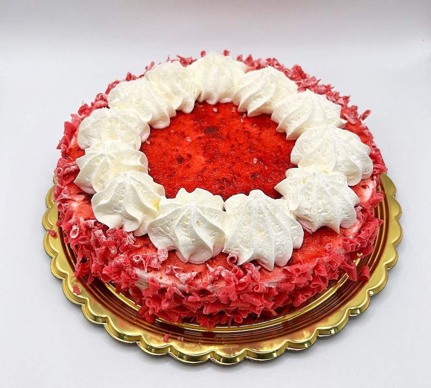A four-layered cake with delicate vanilla sponge and vanilla cream with strawberry pieces. Topped with strawberry sauce, strawberry chocolate shavings and cream
