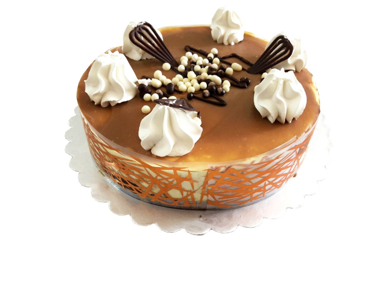 Banana and toffee flavoured ice cream cake. Topped with toffee sauce, cream swirls, chocolate fans and mixed chocolate balls