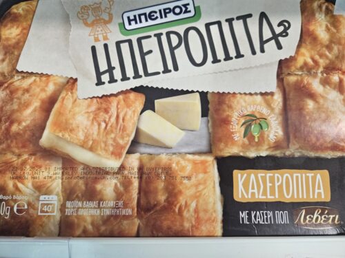 Dough 63% : wheat flour, water, extra virgin olive oil (3%), salt, sugar, yeast, sour-dough (0,5%), sheep milk cream. Filling 37% : gouda cheese (other ingredients:colouring : beta-carotene), water, smoked bacon (21%) (pork meat 85%, spices mixture (containig coriander seeds, suniper berries, caraway seeds, mustard grains and red pepper and clove extract), water, salt, soya protein, dextrose, sacharose, wheat maltodextrine, antioxidants: sodium ascorbate and sodium erythorbate, acidity regulator: sodium lactate, emulsifiers: disodium diphosphate and pentasodium triphospate, preservative: sodium nitrite, smoke), edam cheese (other ingredients:colouring : beta-carotene), traditional kaseri cheese (5%), hard cheese kefalotιri, semi hard cheese, sheep milk cream, wheat semolina, egg white powder, modified potato starch.